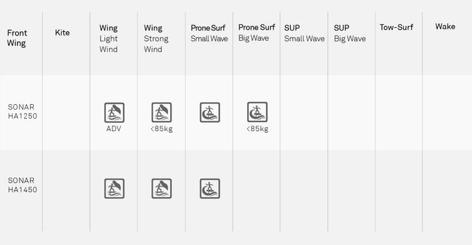 The High Aspect HA1250 beats upwind like nothing else. The ultimate front wing for wing-foiling at speed, the HA1250 boasts high lift, speed, and glide in flat or choppy water. Exceptional efficiency and pumpability allows you connect wave after wave when prone or SUP foil surfing. It’s high wingspan to chord length ratio and relatively thin profile is similar to a sailplane glider wing. With this style of wing, you generate maximum efficiency and lift. The short chord length defines the profile thickness, and with a thin profile comes reduced drag. The span gives you stability, with a slightly longer radius turn than a lower aspect ratio wing of the same size. The Sonar HA1250 is an ideal wing for those days when the rides are long, and waves peel endlessly across the bay.